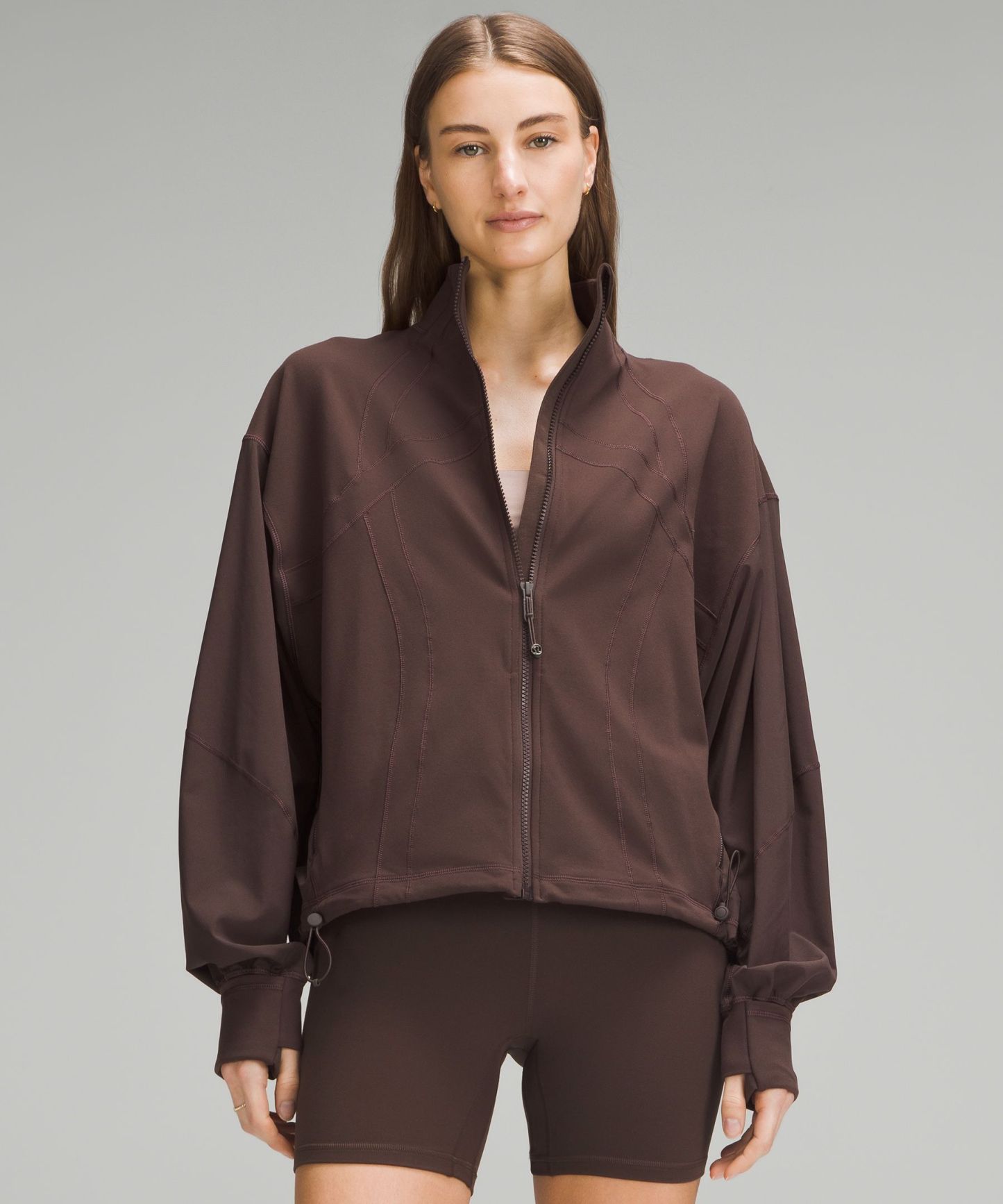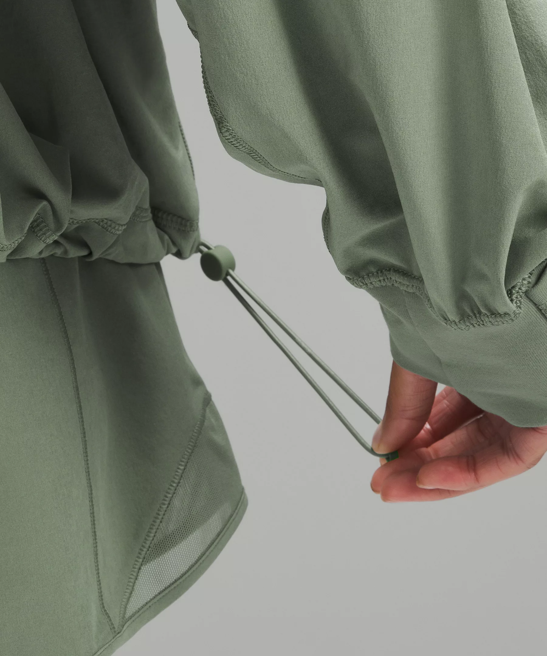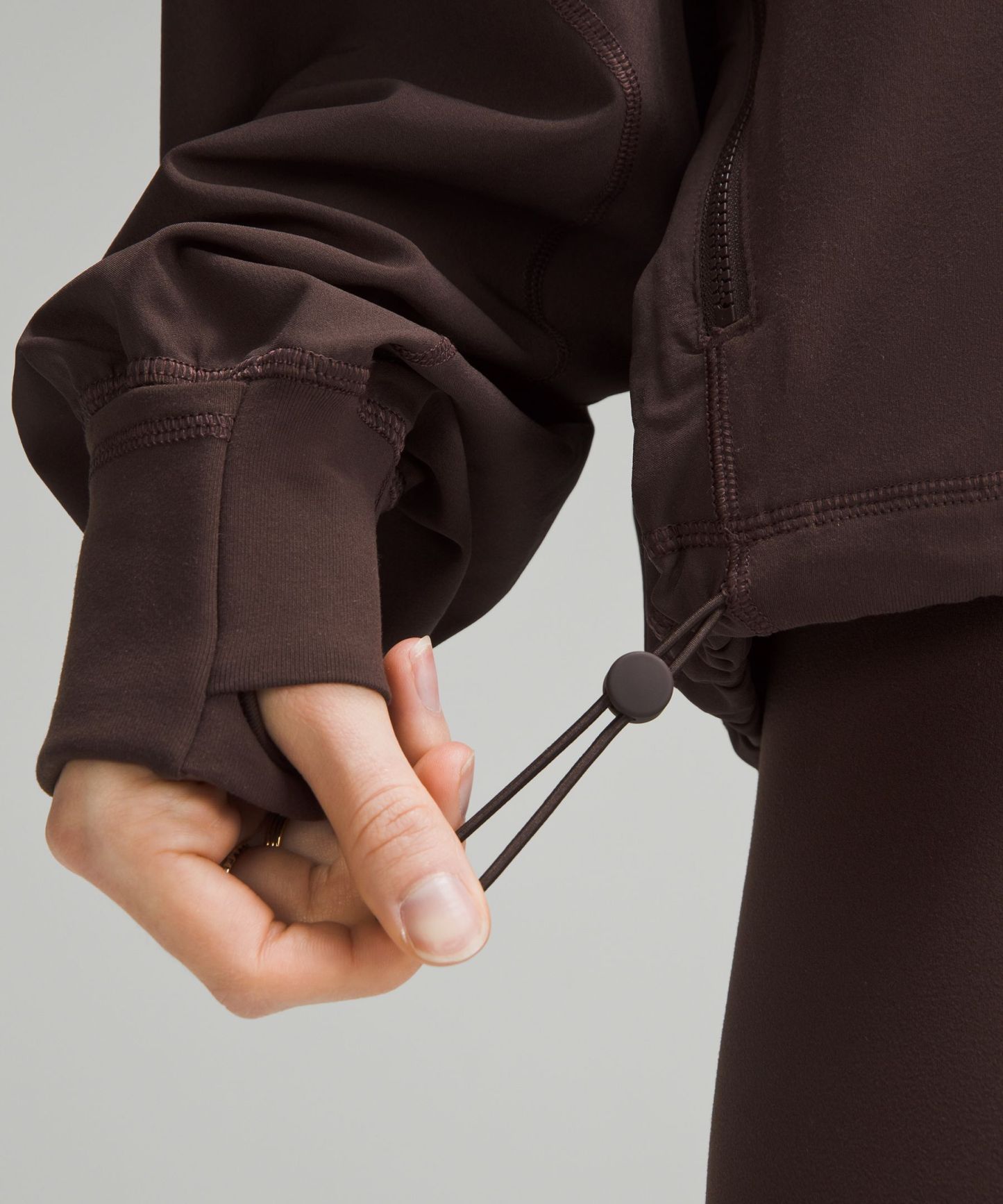 - Elastic zipper pull doubles as an emergency hair tie