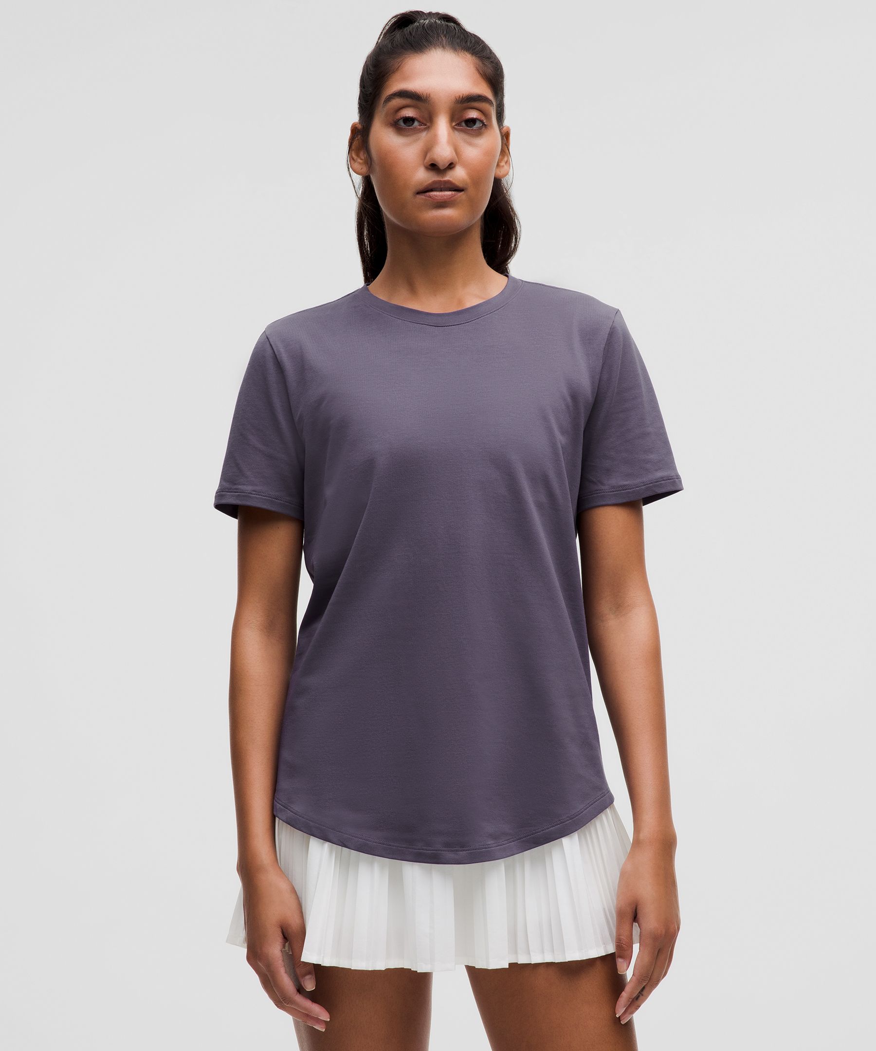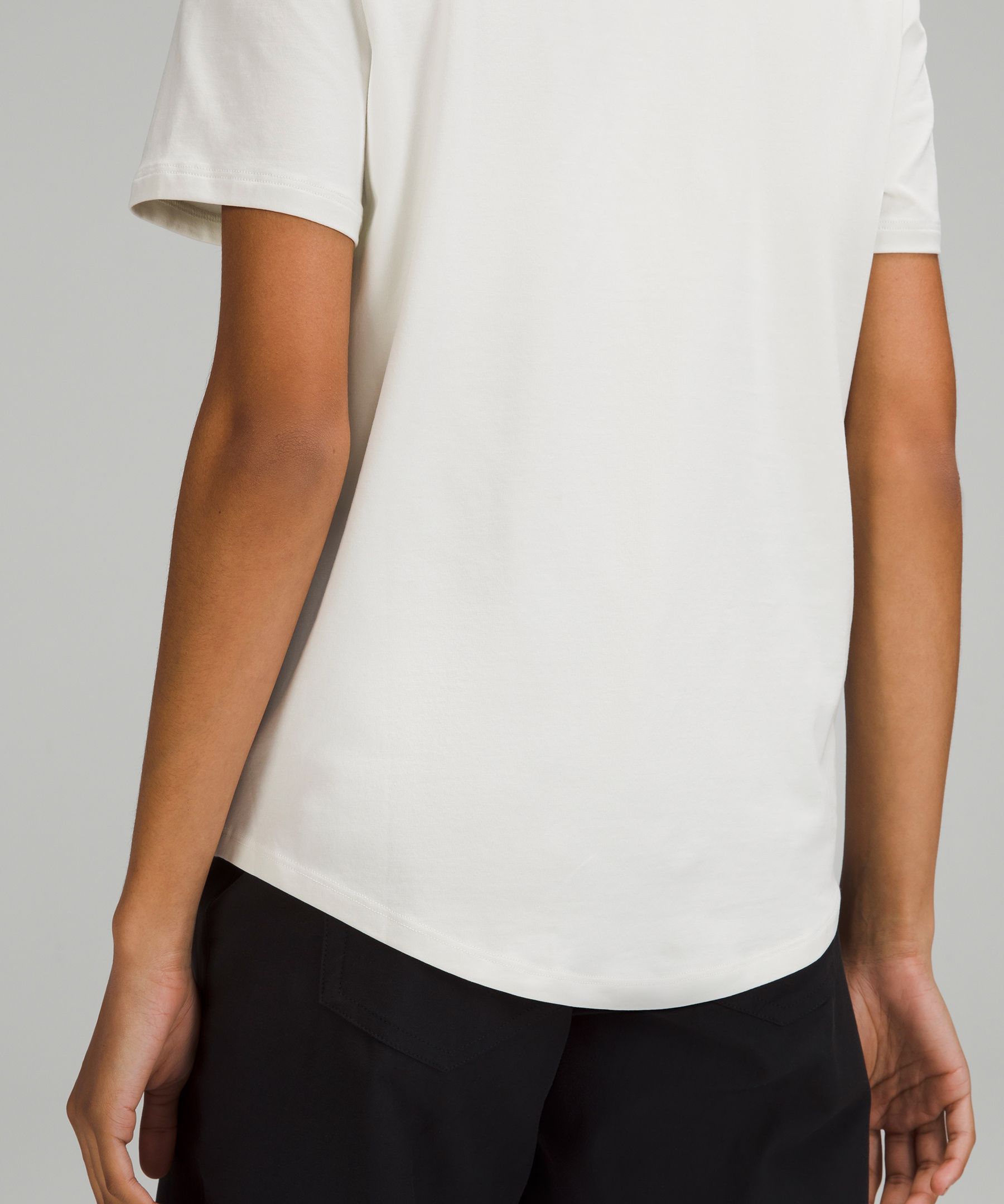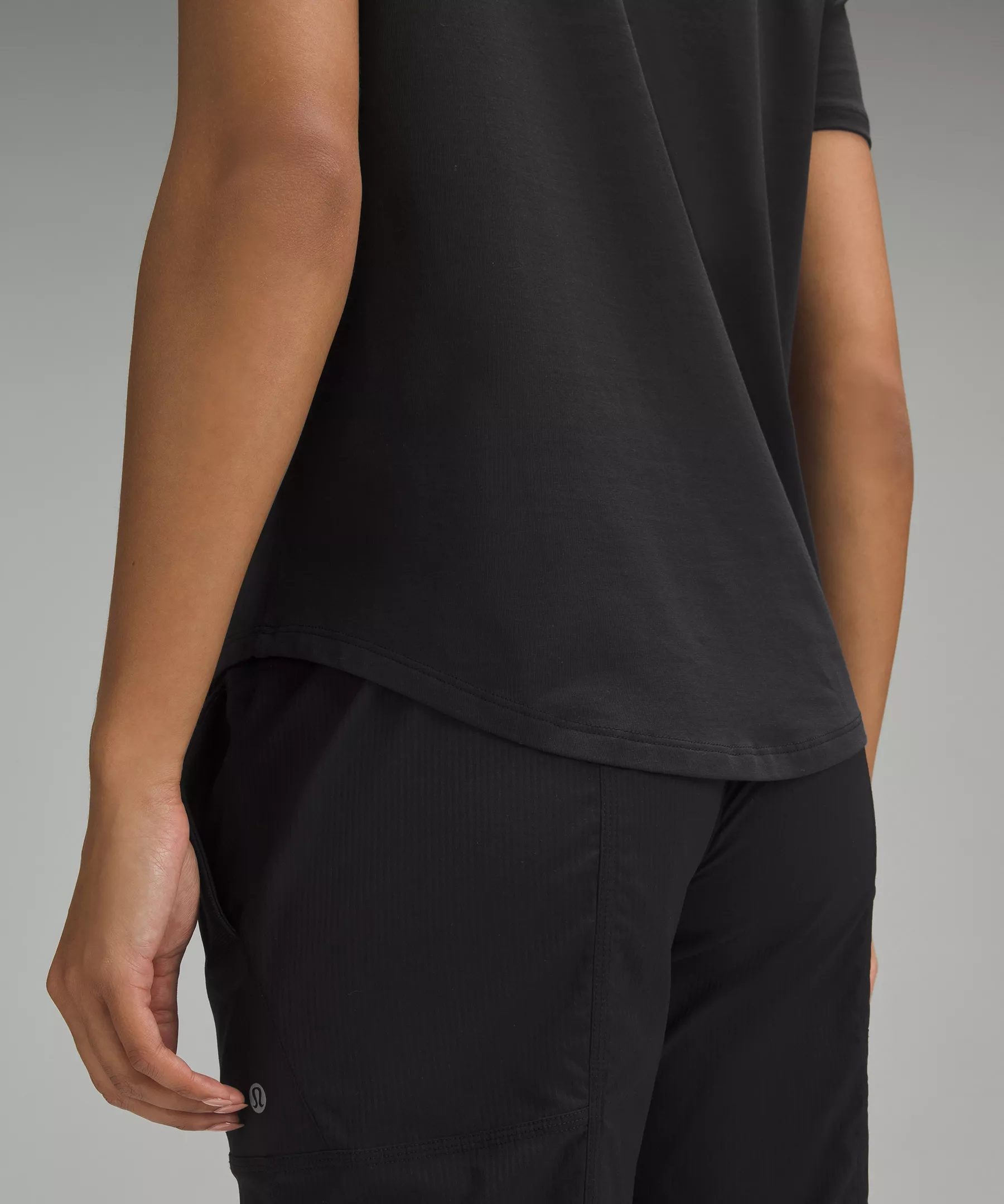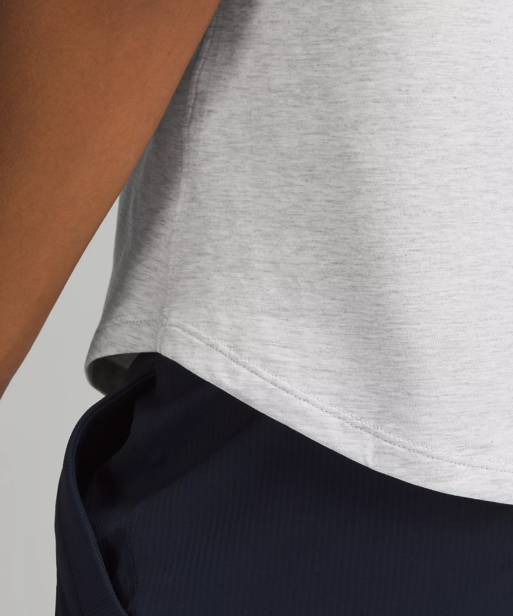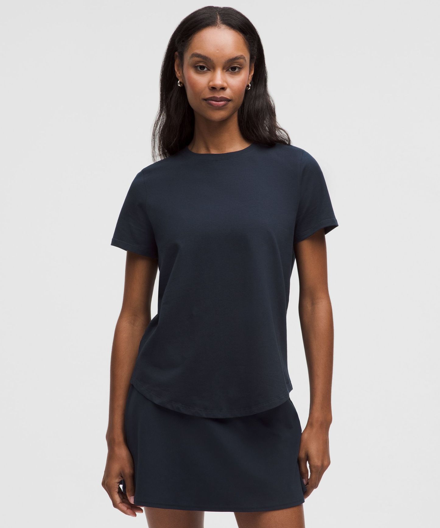 Curved hem hits below the waistband for moderate, everyday coverage
