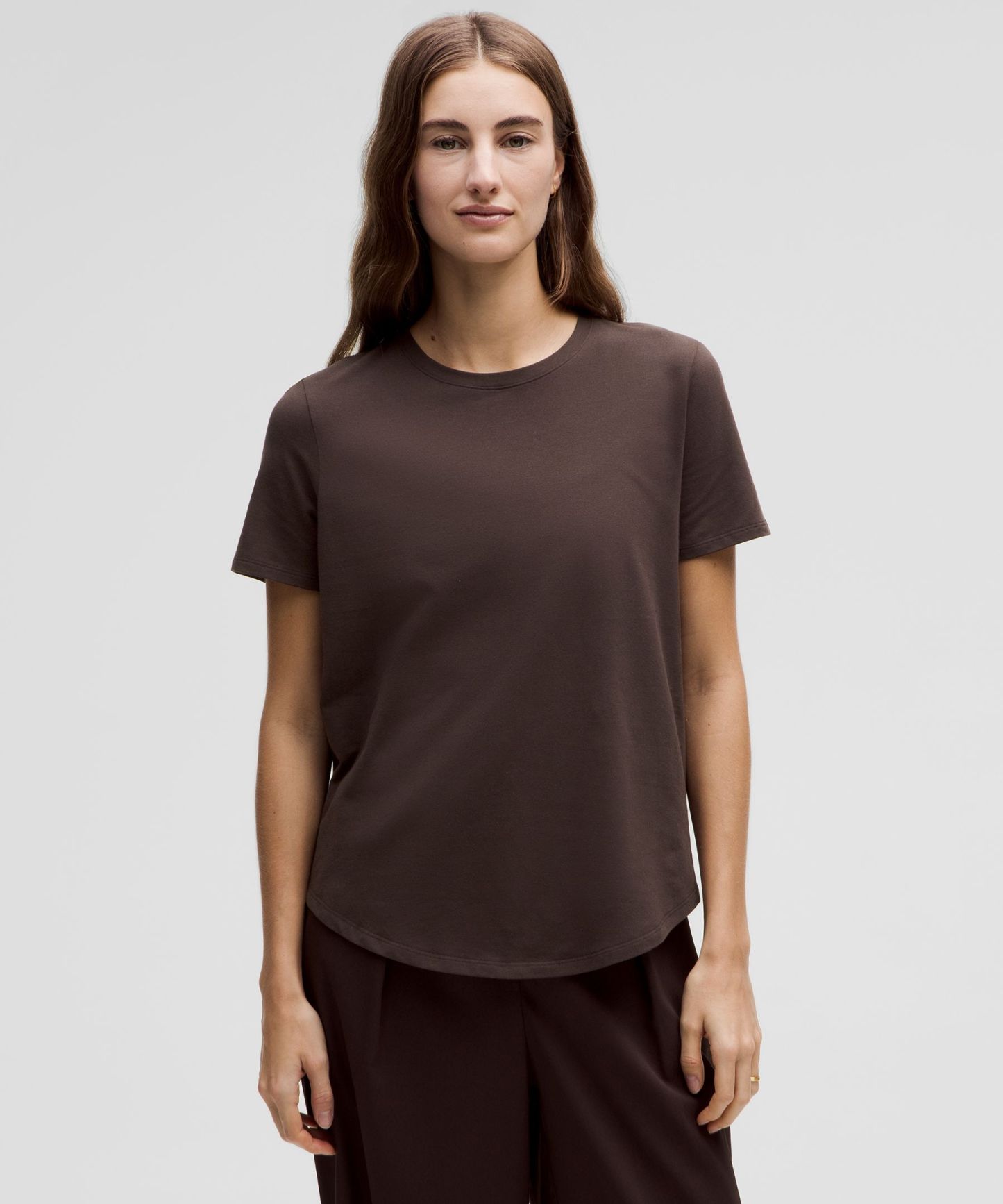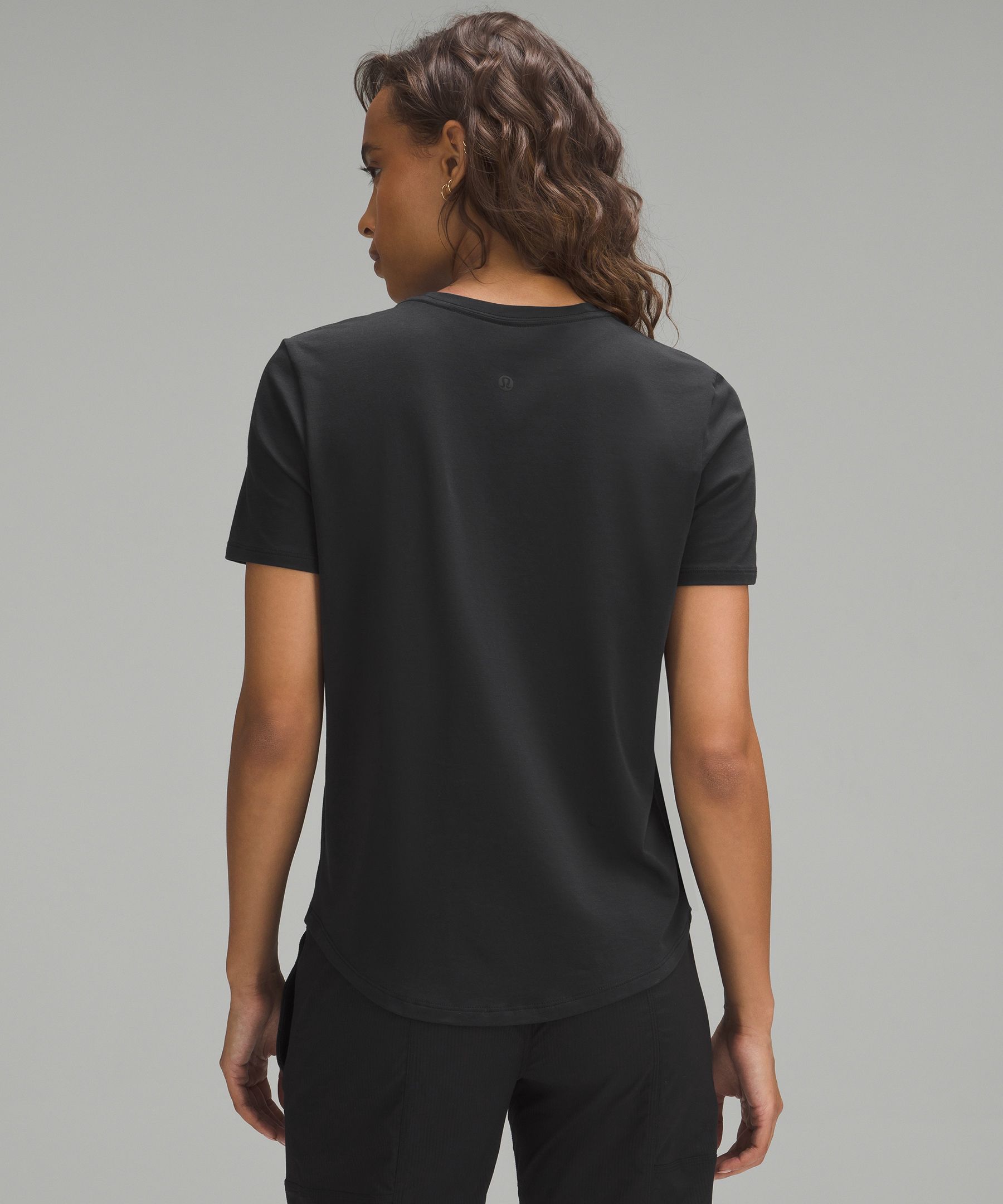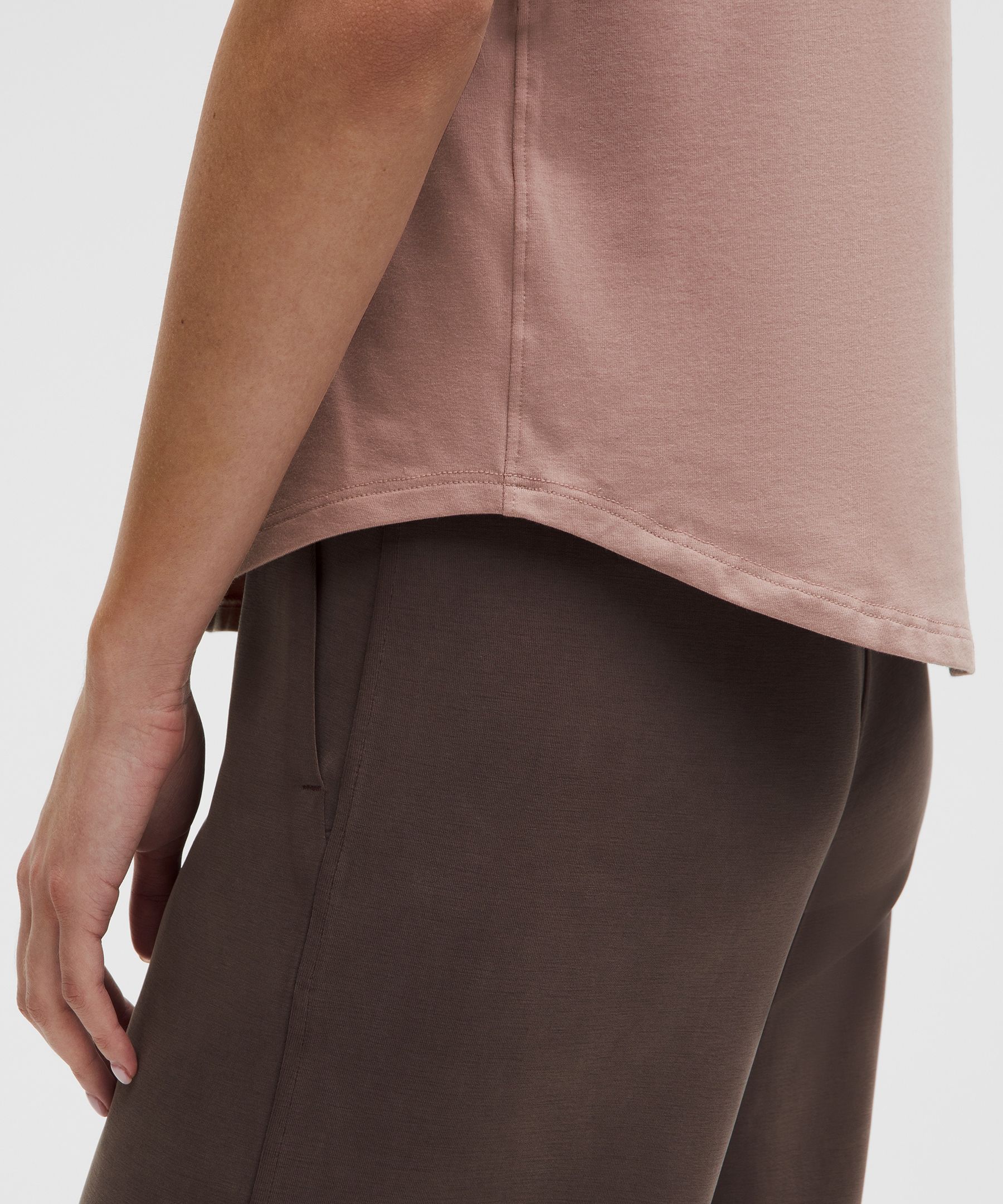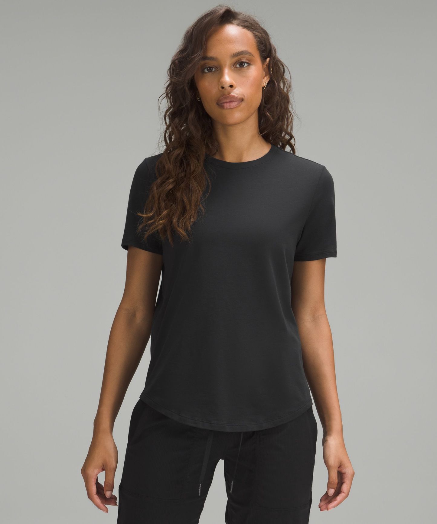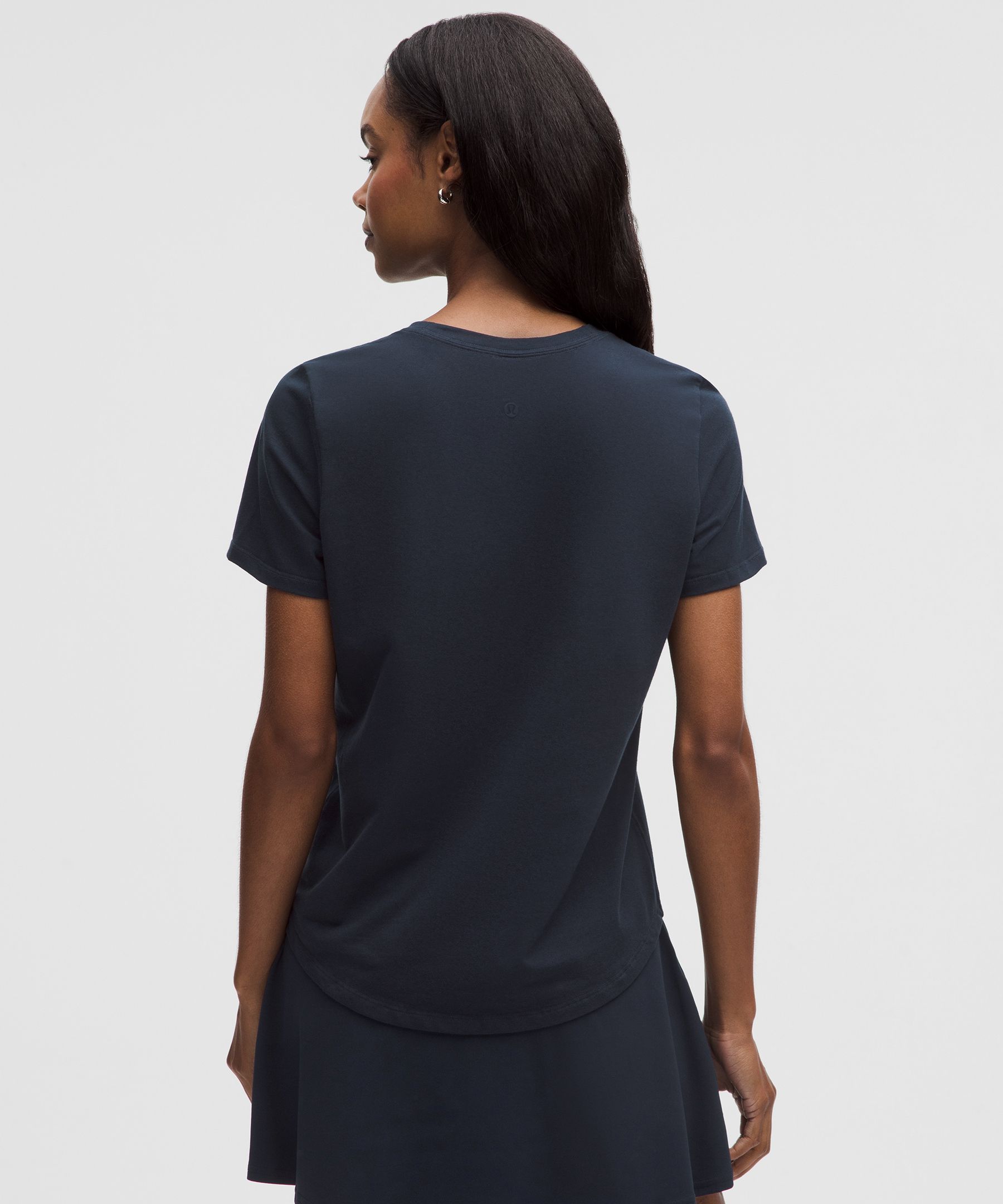 Curved hem hits below the waistband for moderate, everyday coverage