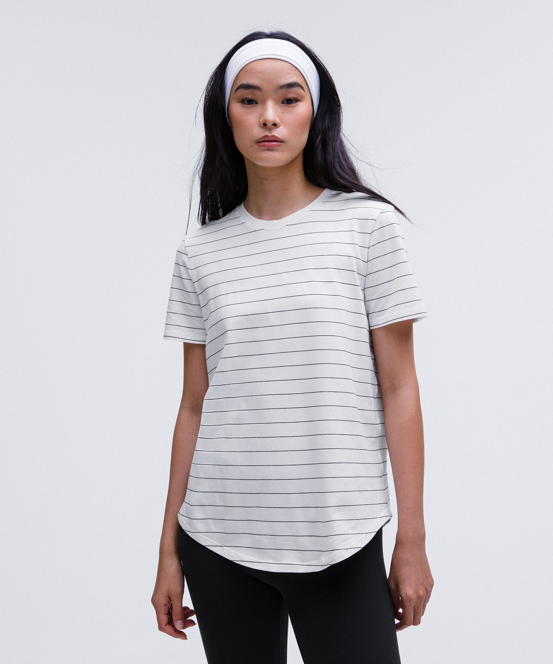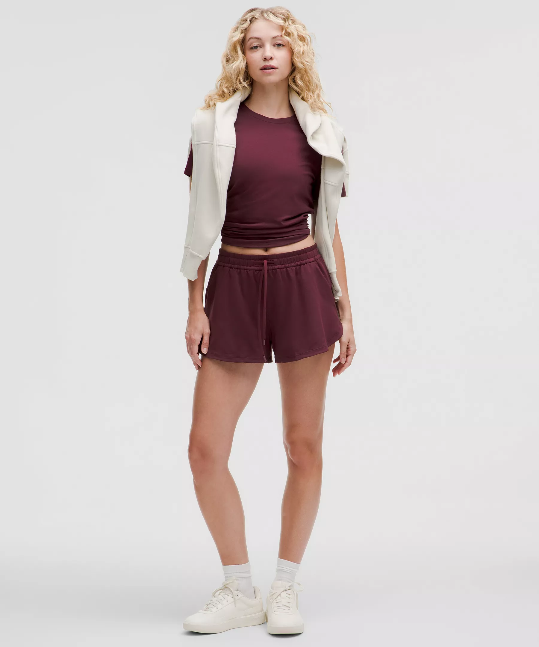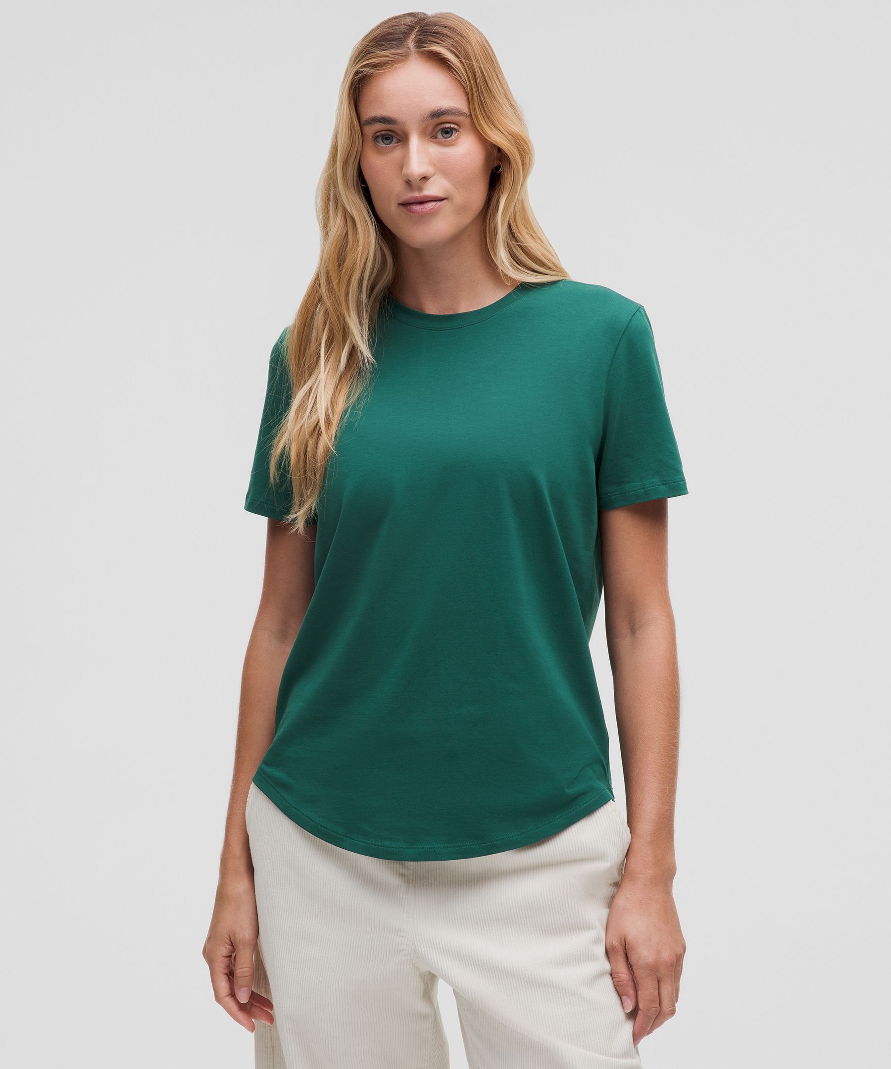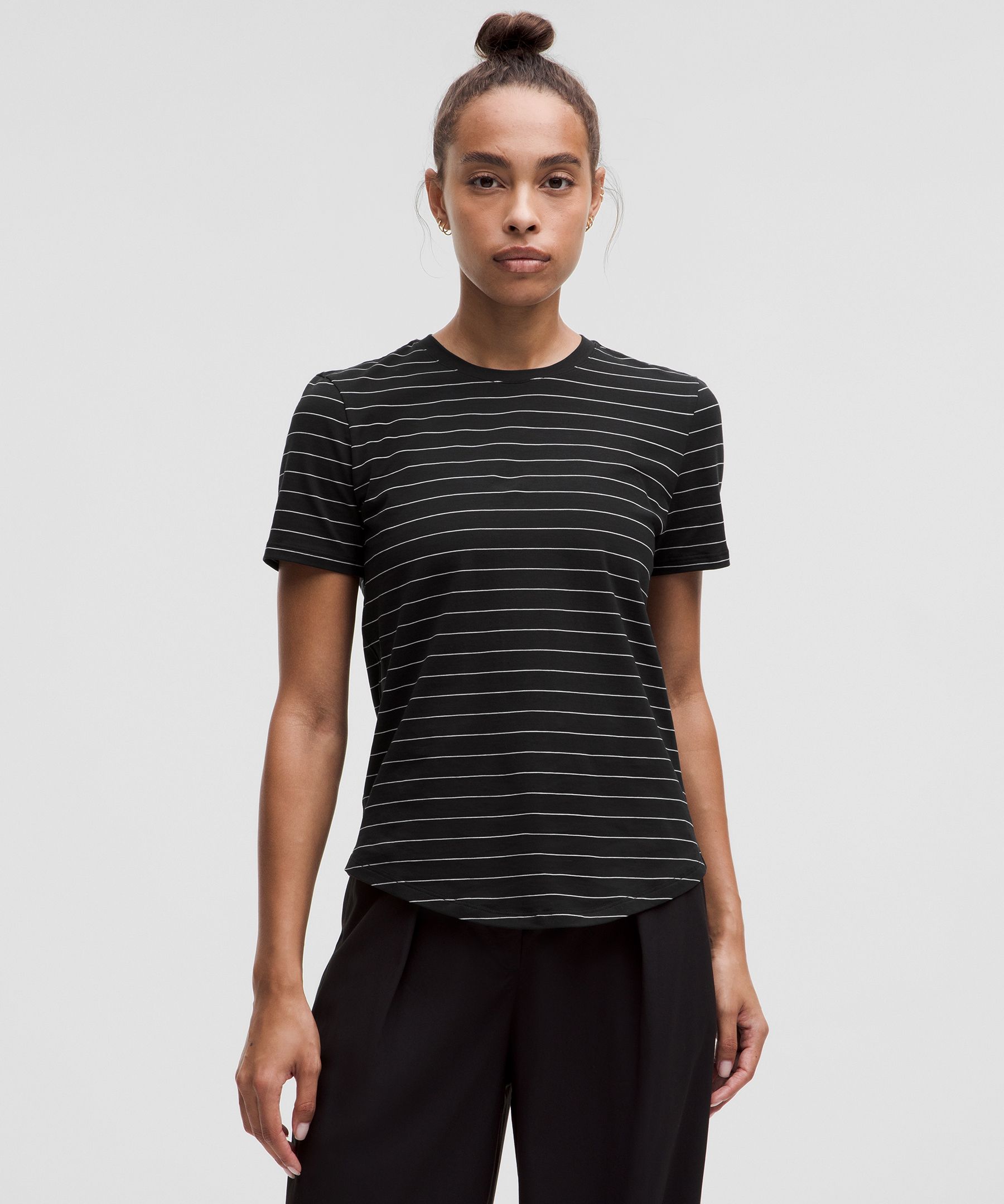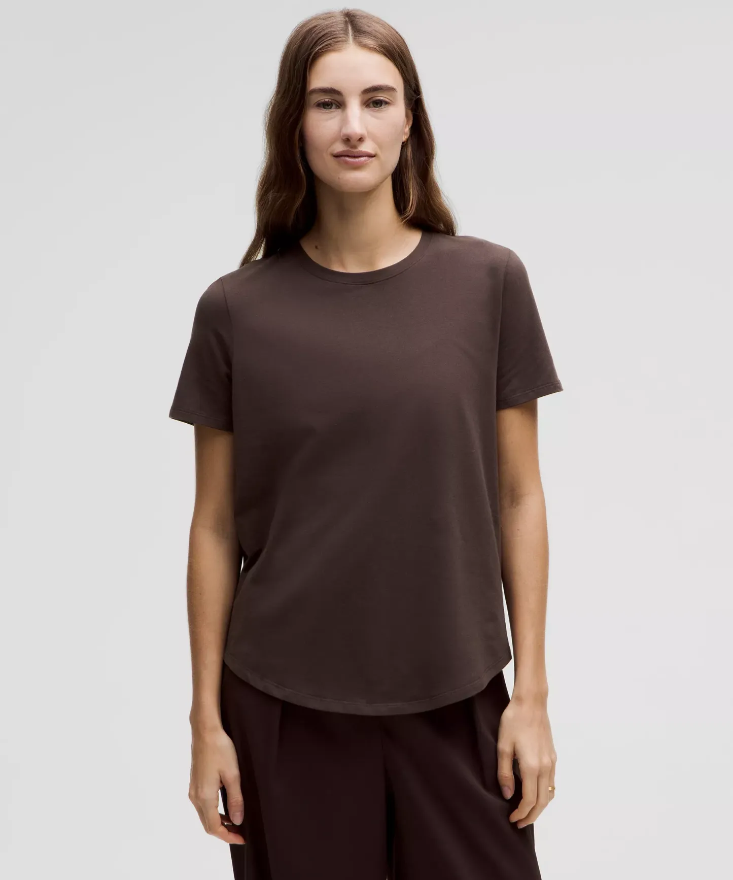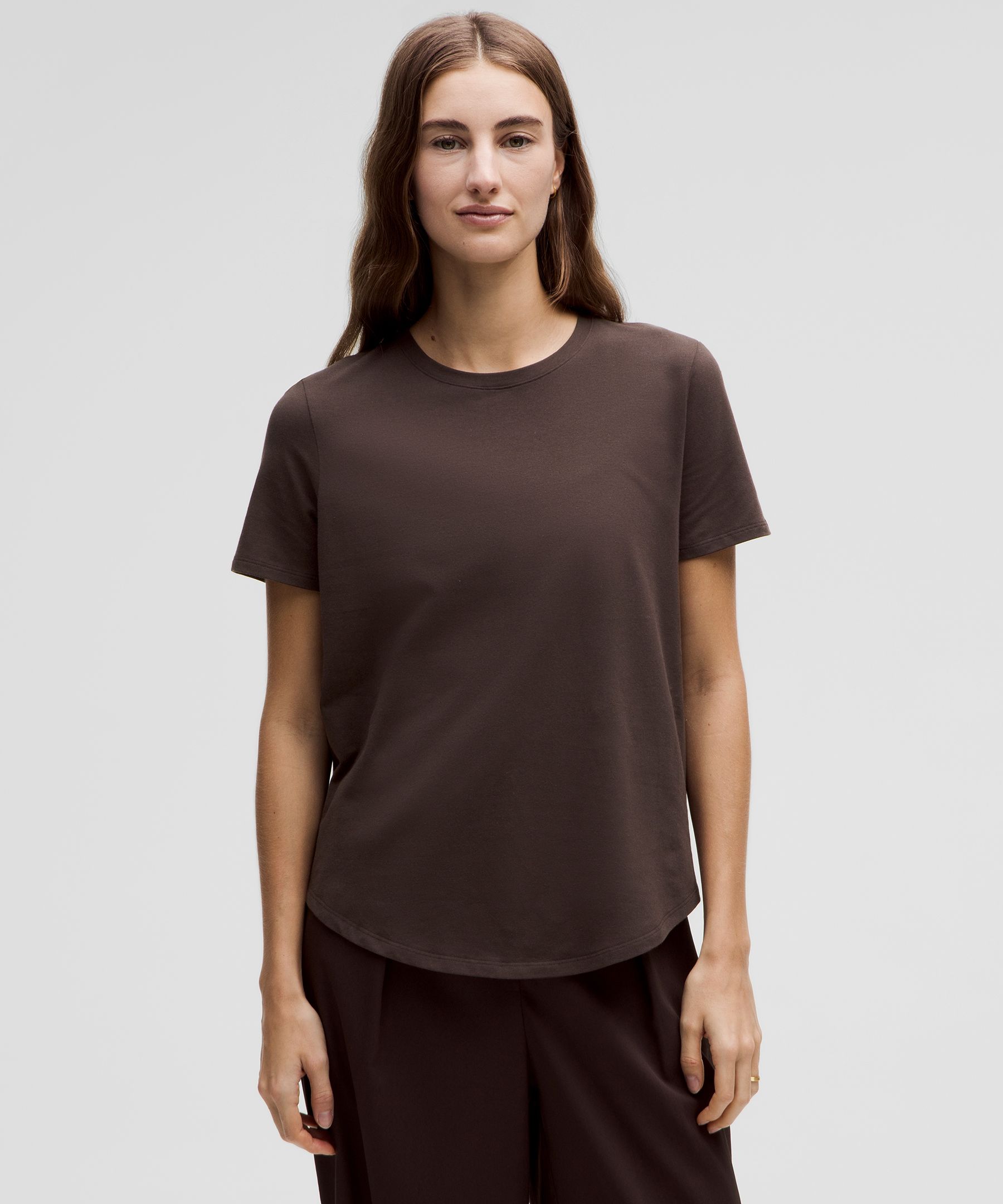 Curved hem hits below the waistband for moderate, everyday coverage