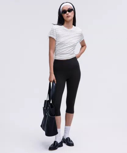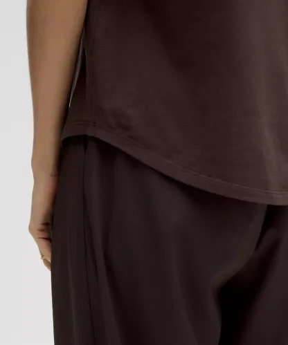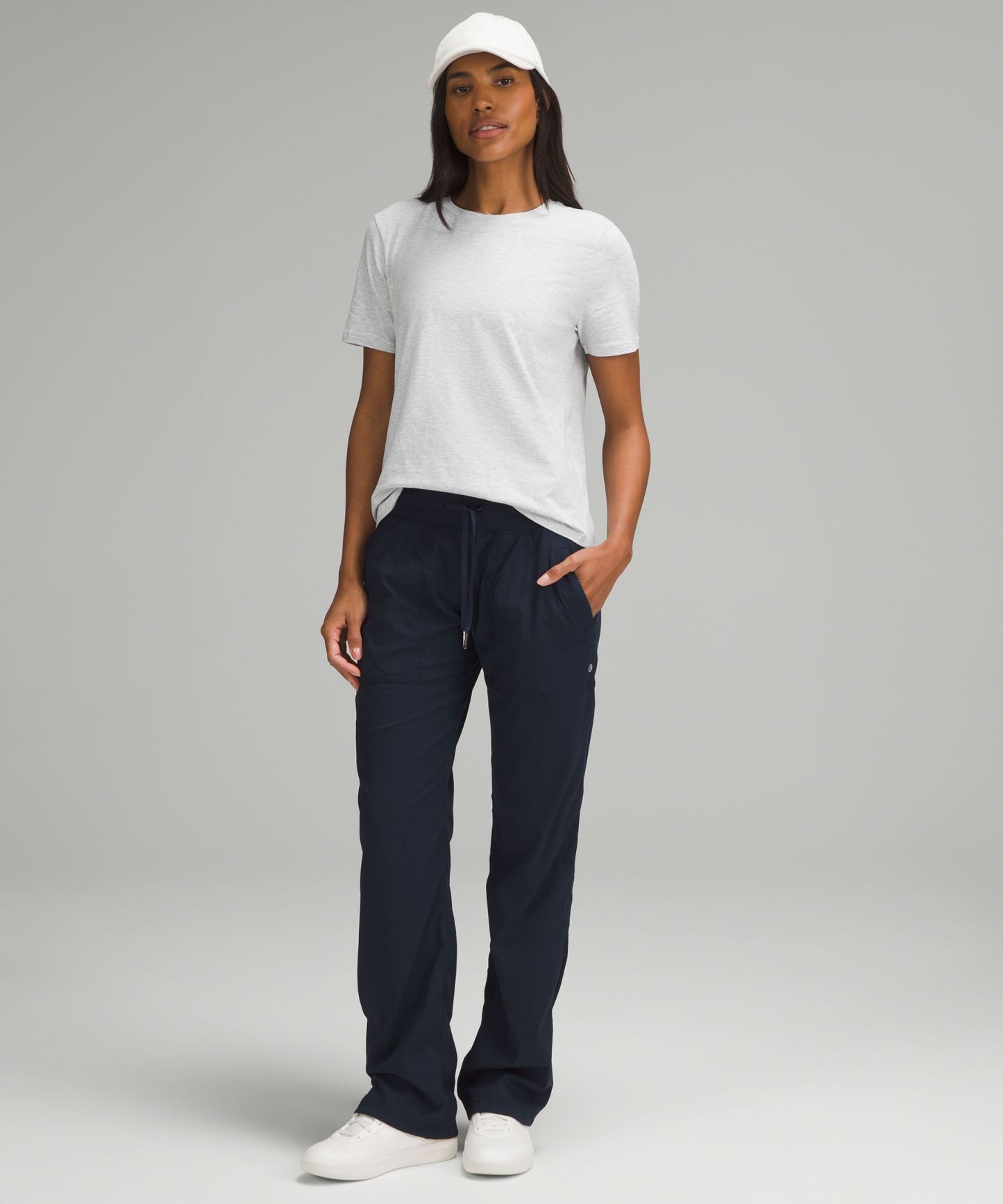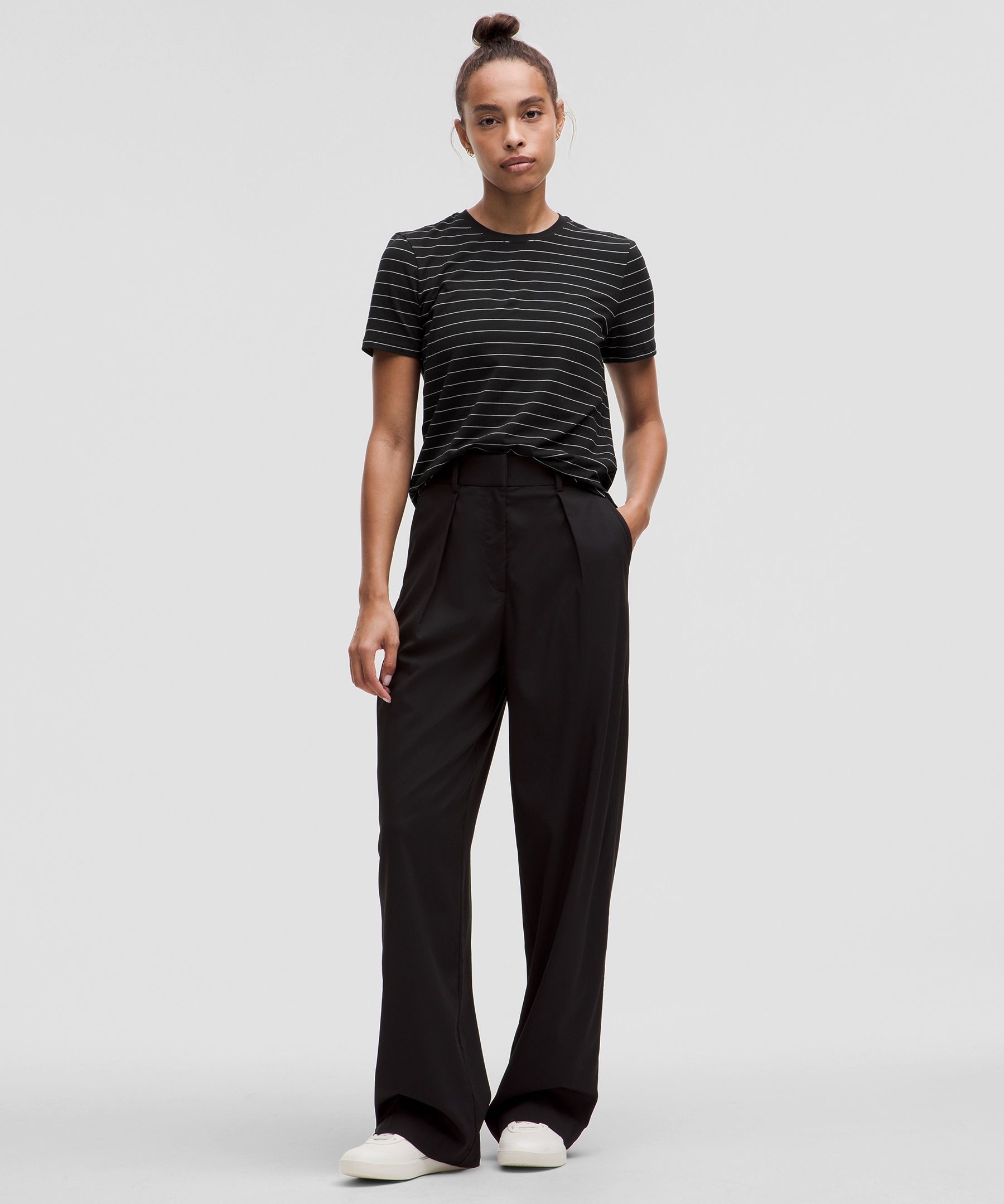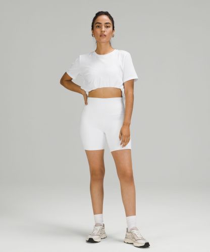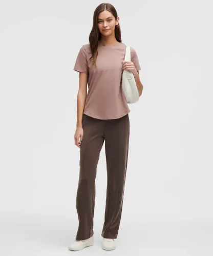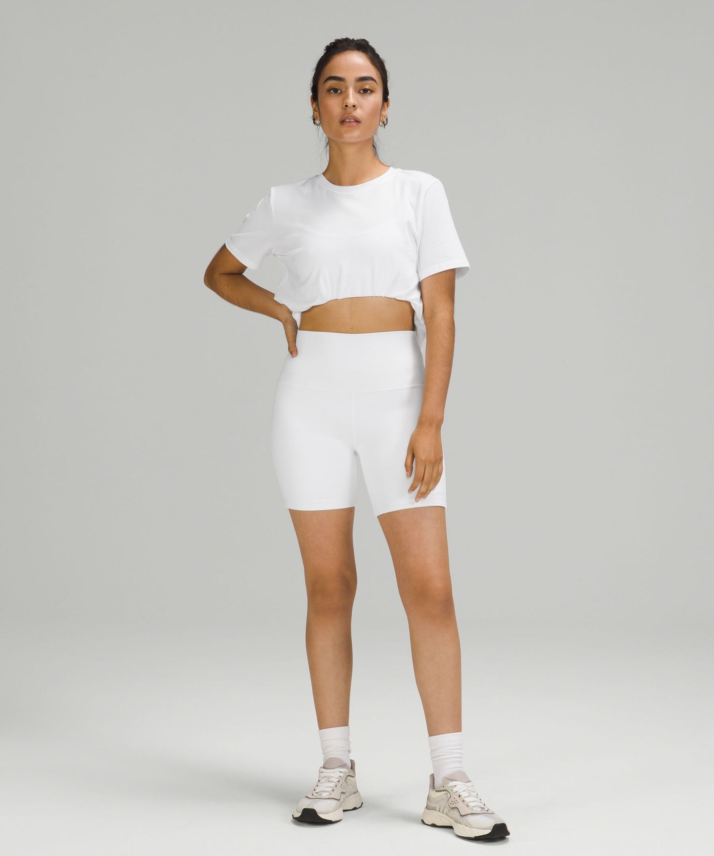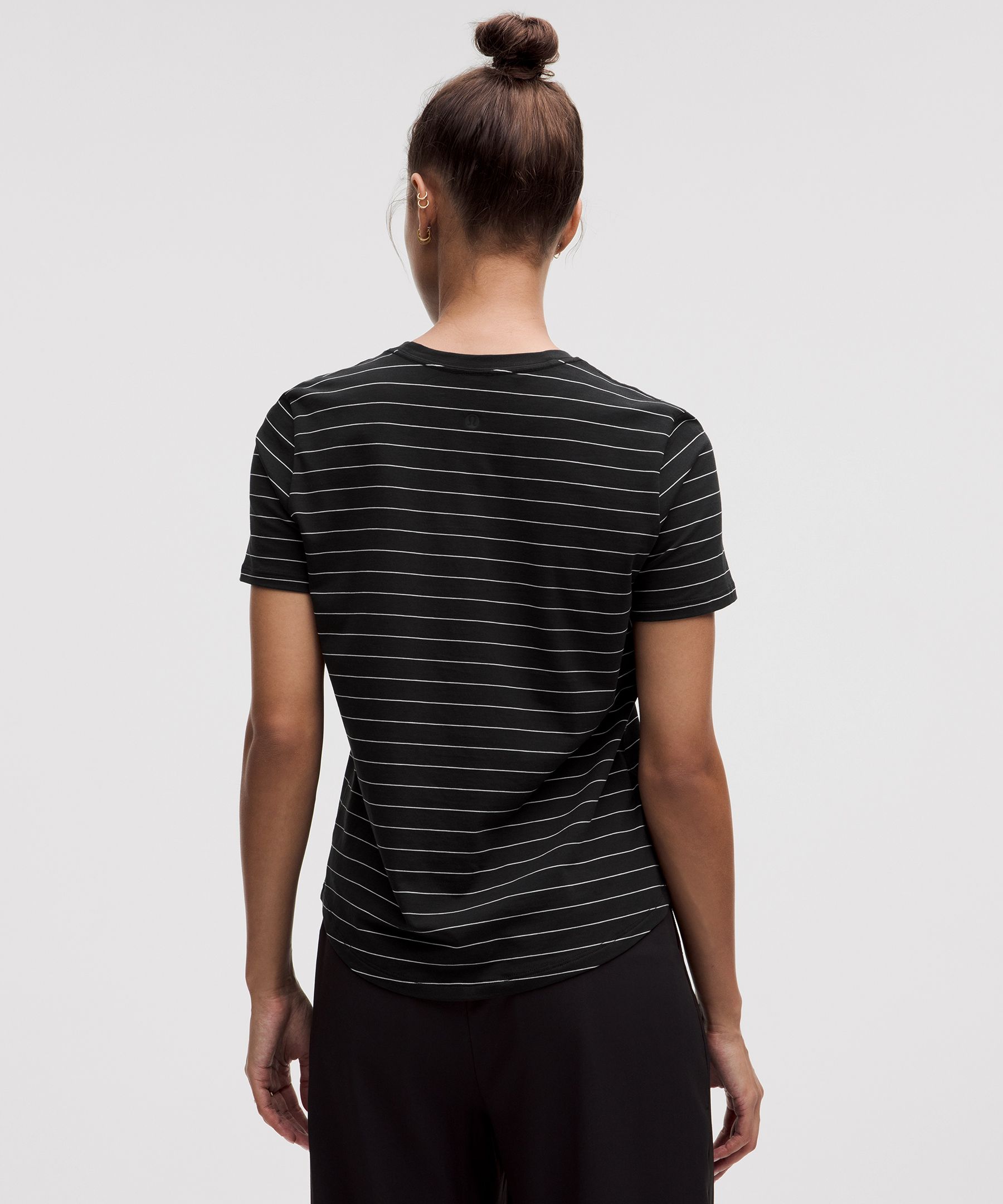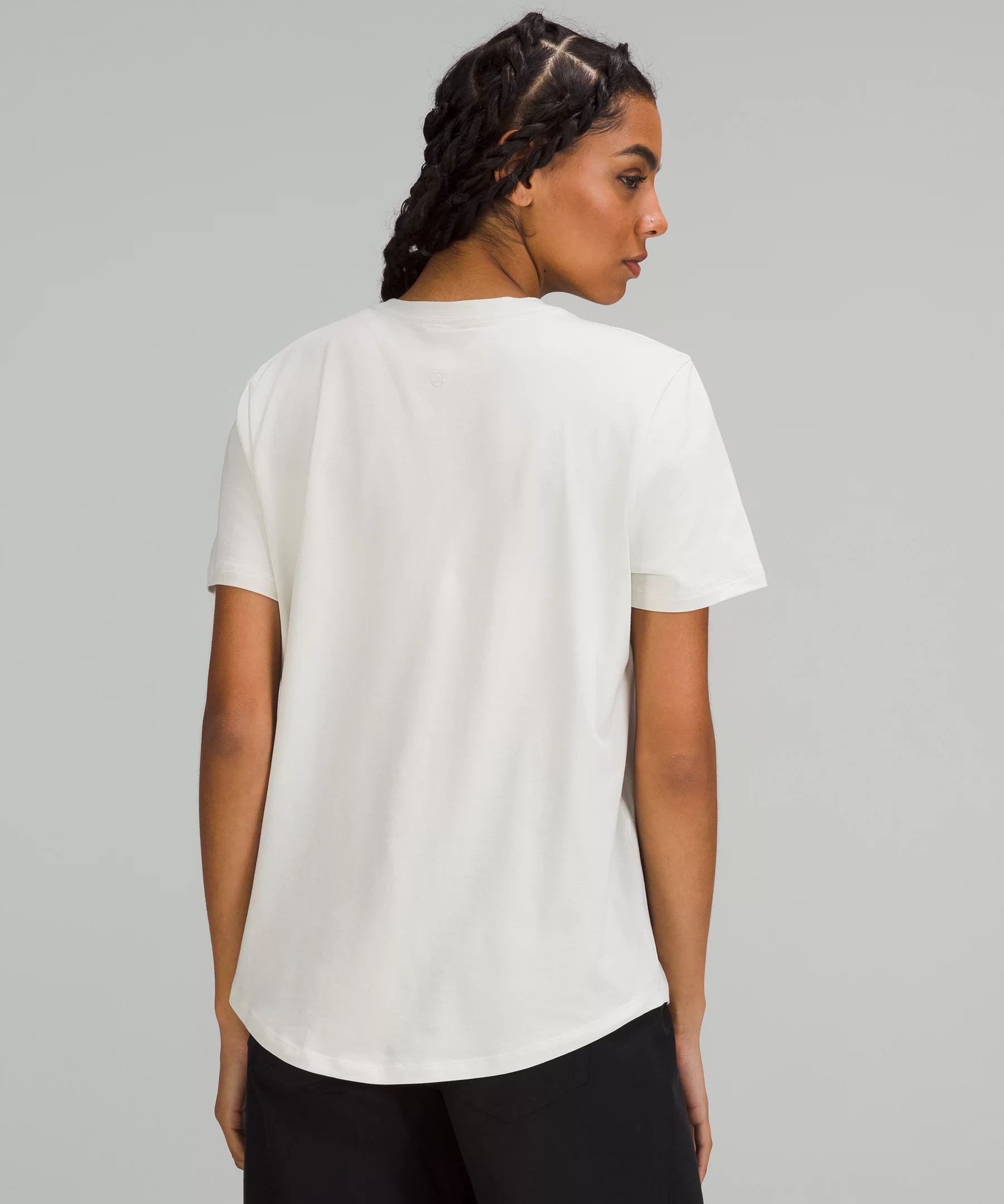 Curved hem hits below the waistband for moderate, everyday coverage