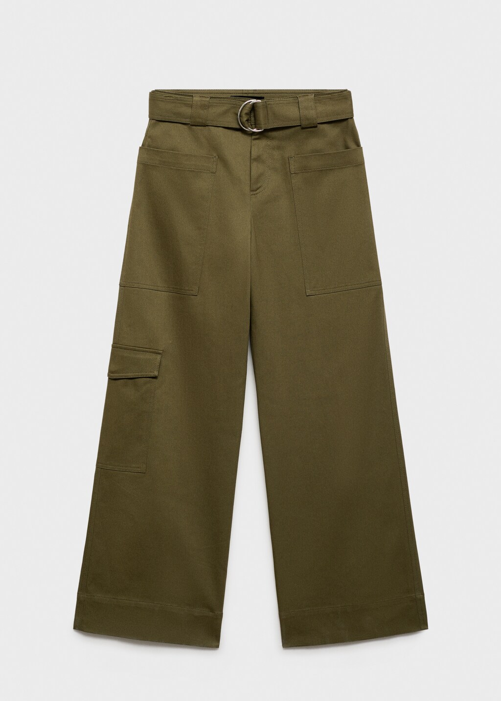 Cotton-blend fabric. Cargo design. Wide-leg design. Long design. High waist. Loops. Cargo pocket. Removable belt. Concealed button, hook and zip fastening. The model is 1.79 tall and is wearing a size 36.