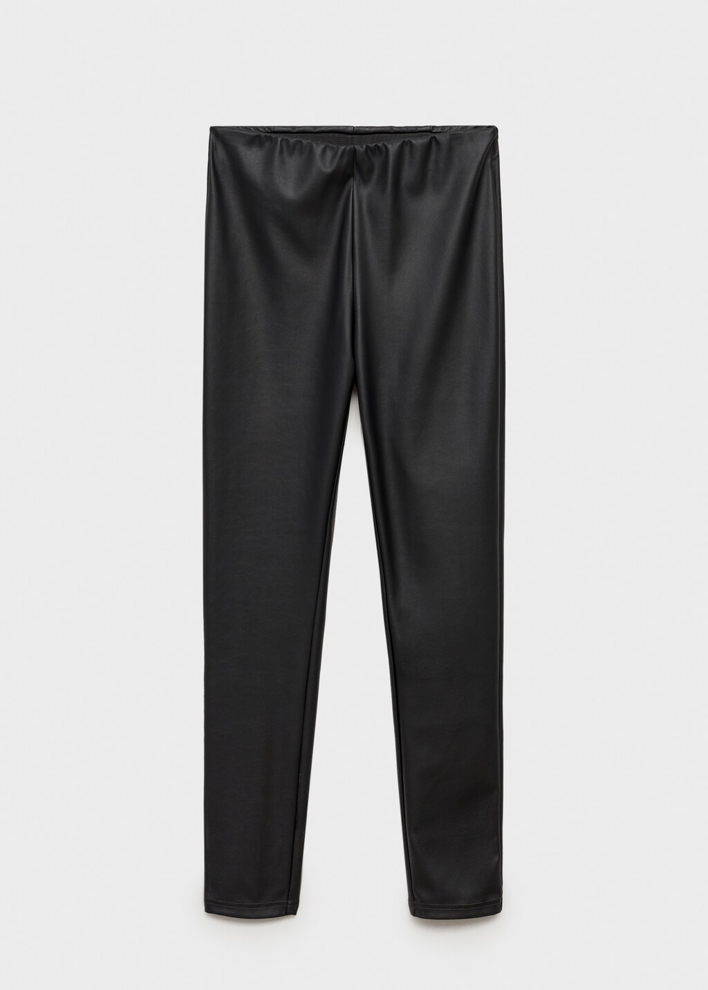 Faux leather. Long design. Elastic waist. Unclosed. The model is 1.75 tall and is wearing a size 36. Fitted design.