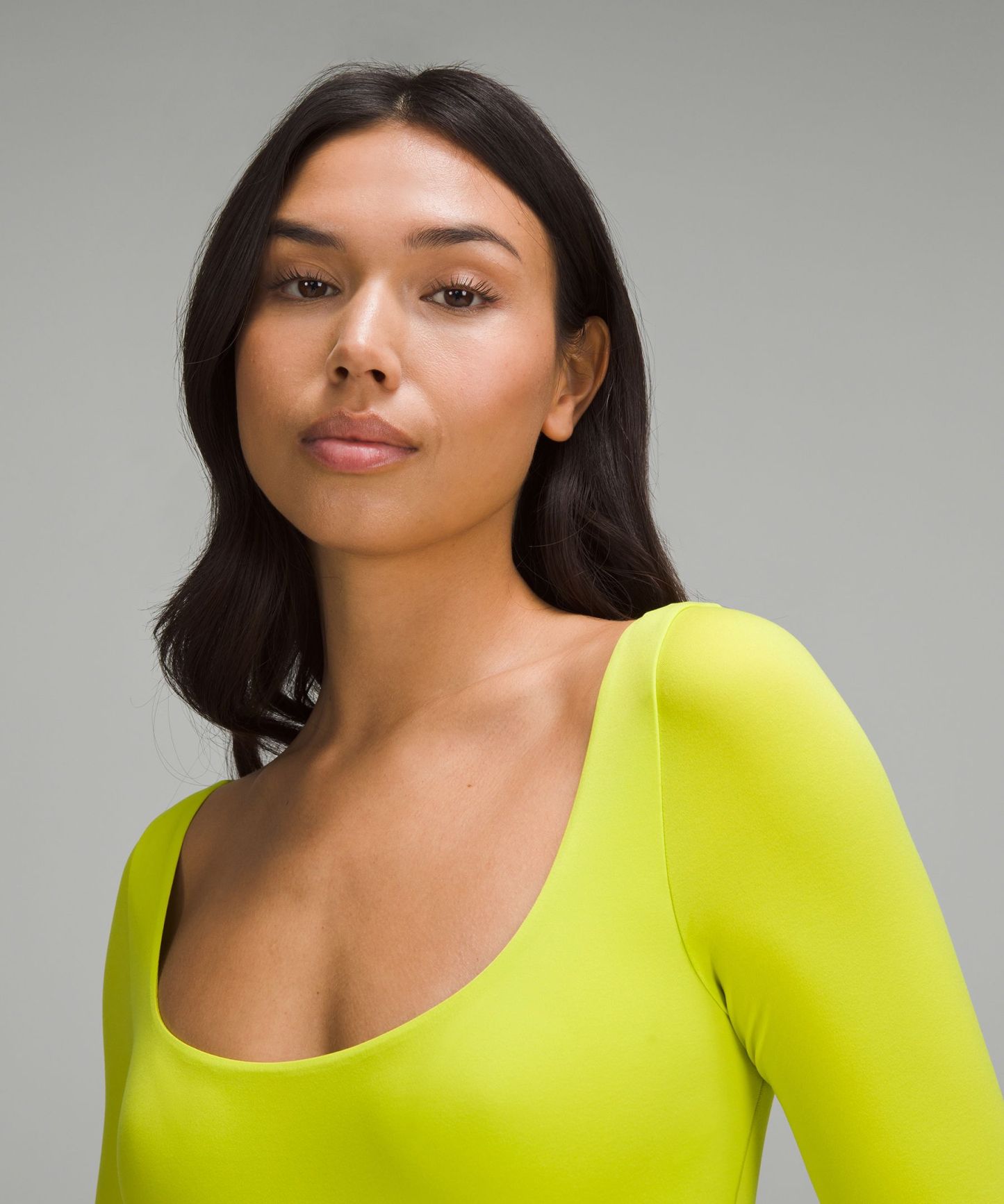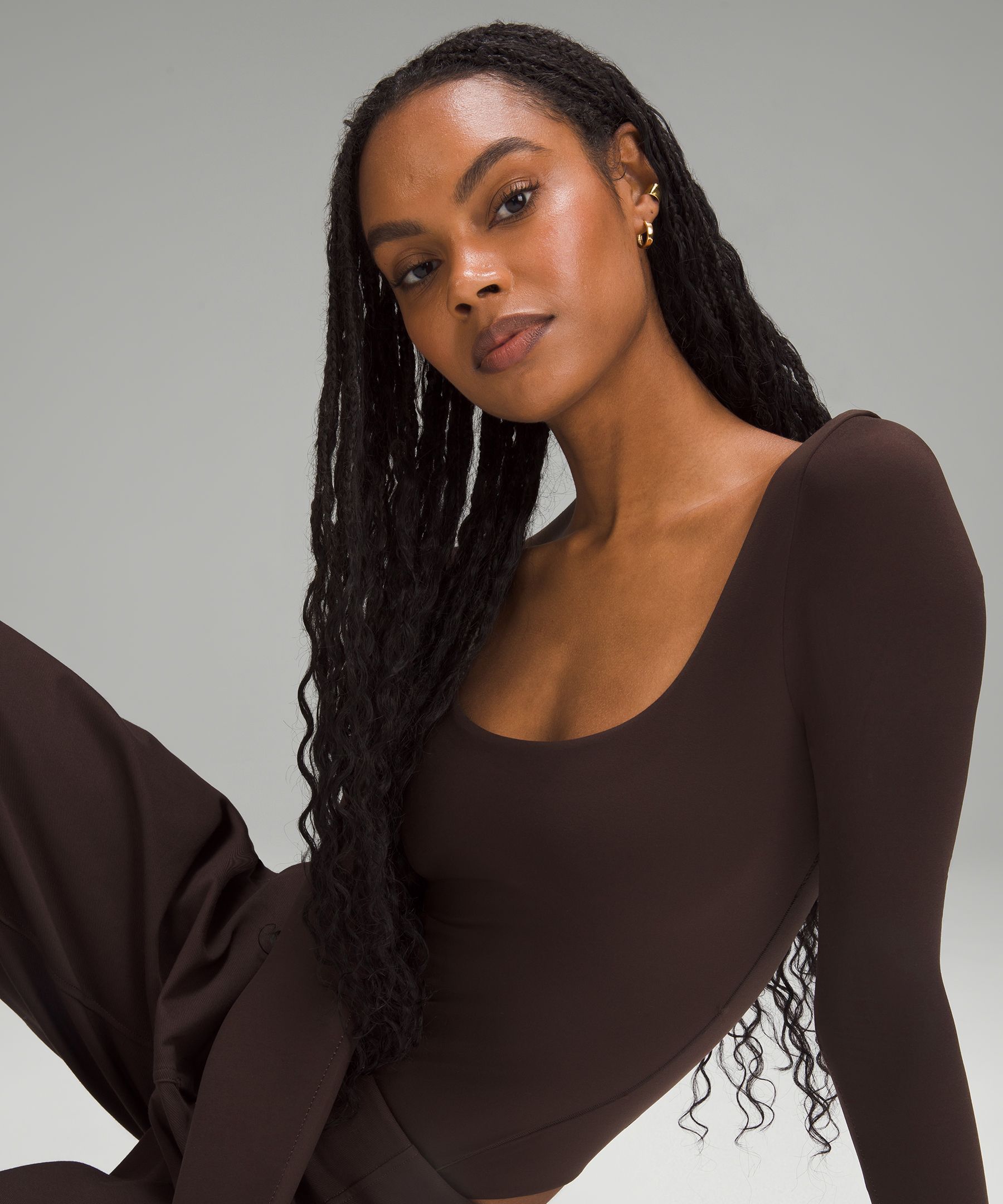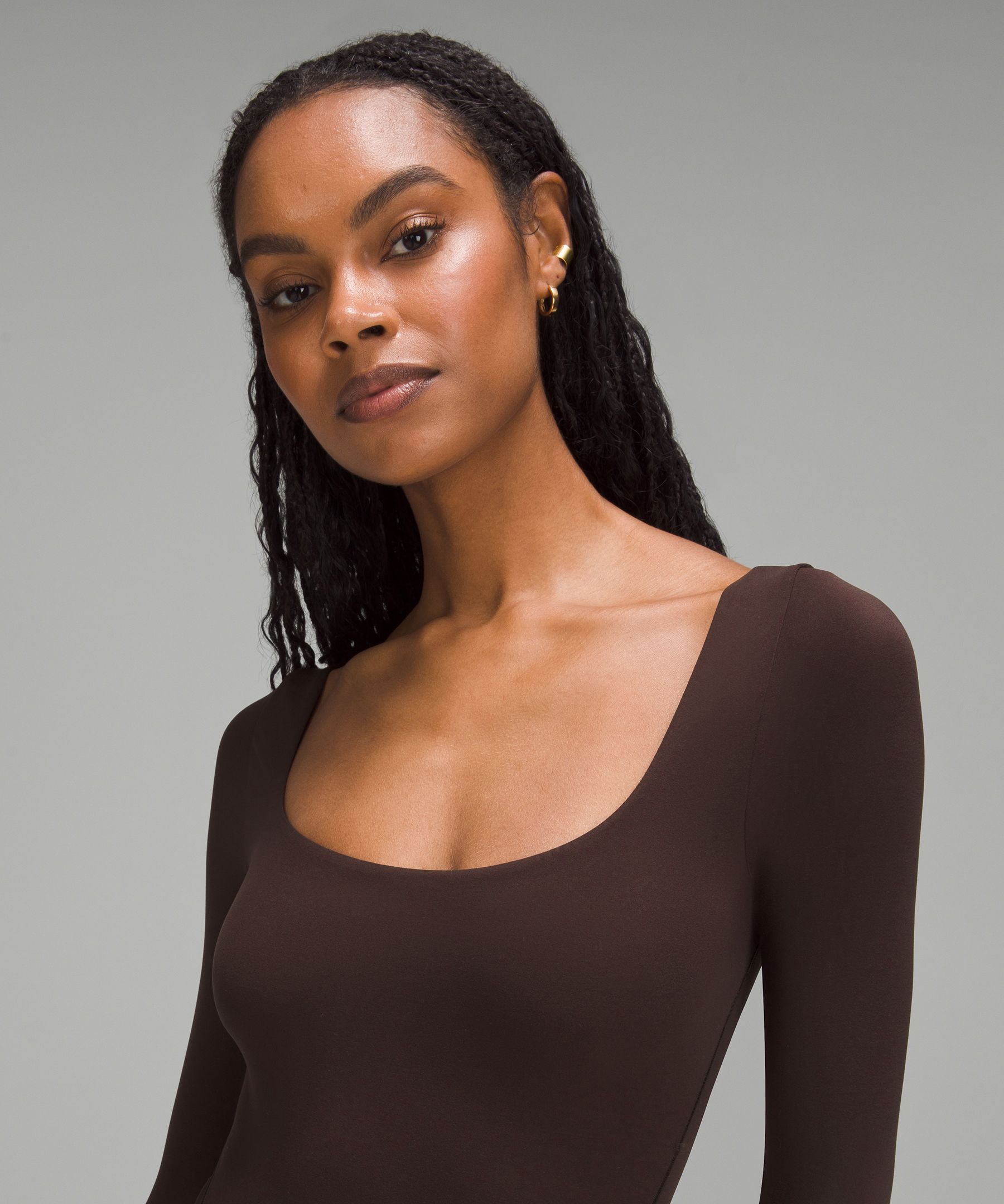 Fabric is double layered for coverage, support, and a seriously soft feel on both sides. The sleeves have a single layer of fabric